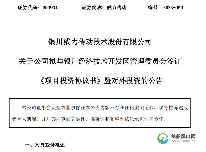 9月23日,银川威力传动技术股份有限公司(以下简称“公司”或“威力传动”)发布《关于公司拟与银川经济技术开发区管理委员会签订〈项目投资协议书〉暨对外投资的公告》。
