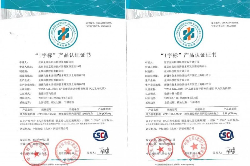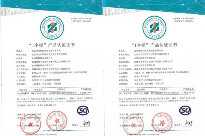 近日,金风科技获得由中关村标准化协会和中标合信(北京)认证有限公司联合颁发的“风力发电机组碳足迹暨‘1字标’产品认证证书”。这也是国内首个风电产品碳足迹核算证书。该证书填补了我国风电产品碳足迹核算、认证和公开方面的空白,可为验证风电产品低碳性、推动中国风电高水平“走出去”提供有力支撑。