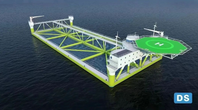 据悉,该平台是一种新型抗风浪由清洁能源驱动的智能化深远海养殖、风电运维综合装备,采用海工平台半潜式结构设计,四角锚泊定位,具有良好的抗台能力。