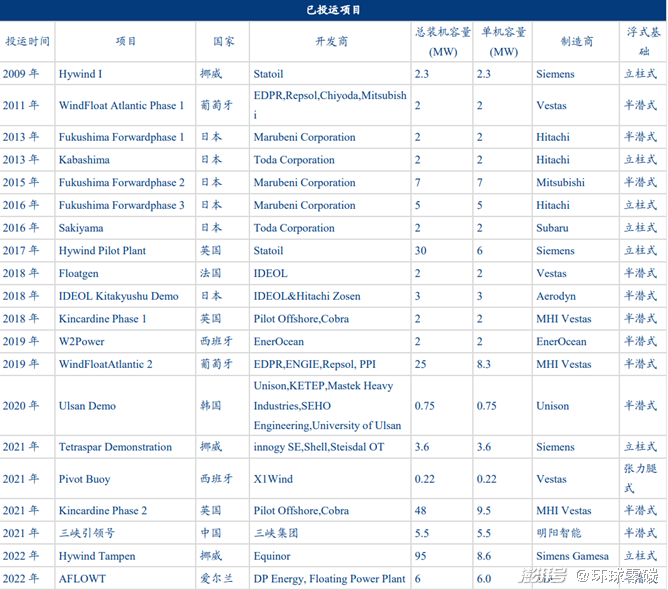 2009年,挪威国家石油(Statoil公司,2018年更名为Equinor)开发了世界上第一个全尺寸漂浮式机组的样机项目——Hywind Demo。项目采用立柱式基础,离岸距离10km,机位和作业水深达200m,基础重量约3200 吨,单机功率2.3MW,成为了漂浮式海上风电行业的重要里程碑。