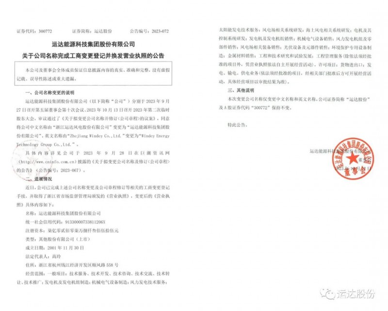 近日,经运达股份股东大会审议通过,运达股份的公司全称正式变更为“运达能源科技集团股份有限公司”,公司已完成上述公司名称变更及公司章程修订等相关的工商变更登记手续,并取得了浙江省市场监督管理局颁发的《营业执照》。