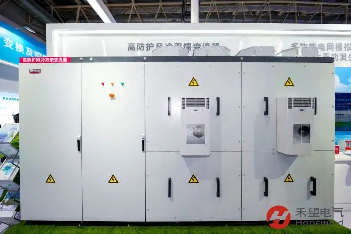 本次北京风能展上,禾望电气展出的是新一代高防护风冷双馈变流器,产品单机最大功率可达12.XMW,采用高效换热技术,具备IP65防护等级,可完美适应海上严苛环境。凭借着领先的控制技术与优异性能,该产品已在市场上批量应用,且成绩斐然。