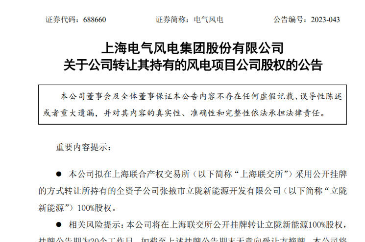 公告披露,电气风电拟在上海联合产权交易所采用公开挂牌的方式转让所持有的全资子公司张掖市立陇新能源开发有限公司(简称:立陇新能源)100%股权,立陇新能源持有高台县风电项目(装机容量为 400MW)。