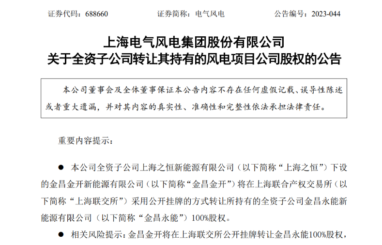 同日,电气风电发布《关于全资子公司转让其持有的风电项目公司股权的公告》,电气风电全资子公司上海之恒下设的金昌金开将在上海联合产权交易所采用公开挂牌的方式转让所持有的全资子公司金昌永能新能源有限公司(以下简称“金昌永能”)100%股权,金昌永能持有金昌风电项目(装机容量为100MW)。