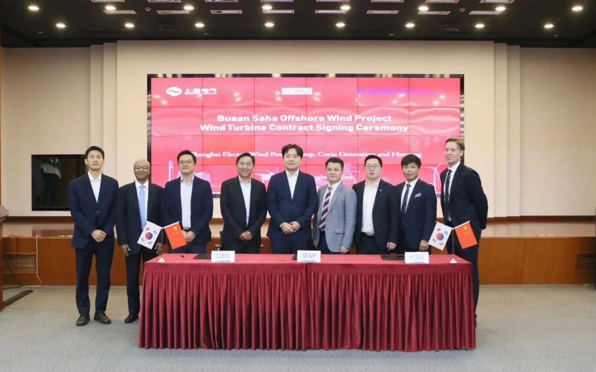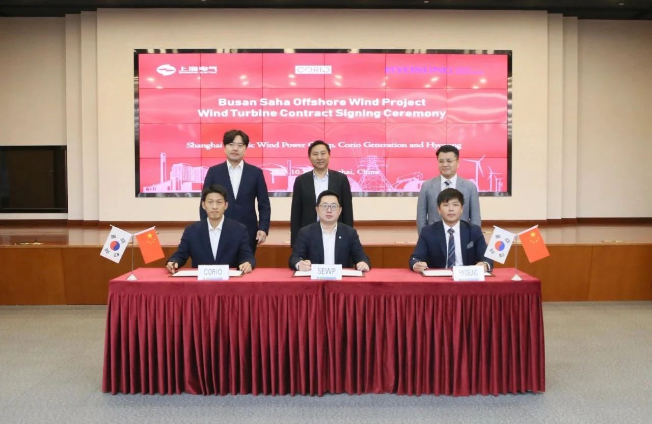 10月20日,上海电气风电集团股份有限公司(以下简称“电气风电”)联合韩国晓星重工集团与韩国Corio发电公司,签订韩国釜山Saha海上风电项目风机销售合同。电气风电党委副书记、总裁王勇代表签约,电气风电党委书记、董事长乔银平及三方高层代表共同见证合同签订仪式。