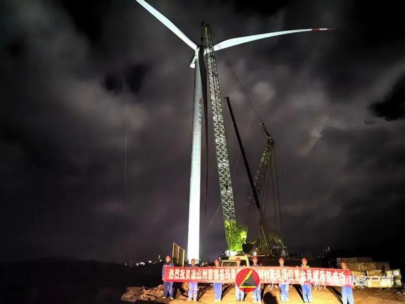 10月28日19点40分,随着首台风机叶轮在110米高空中与机舱精准对接,由国家电投集团投资建设,中电建成勘院、中国五冶集团、川电咨询等单位承建的喜德县玛果梁子130兆瓦风电项目首台风机吊装完成,标志着凉山州单机容量最大、单个叶片最长的风电项目工程建设取得重大节点性突破。