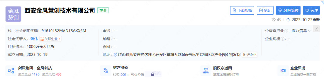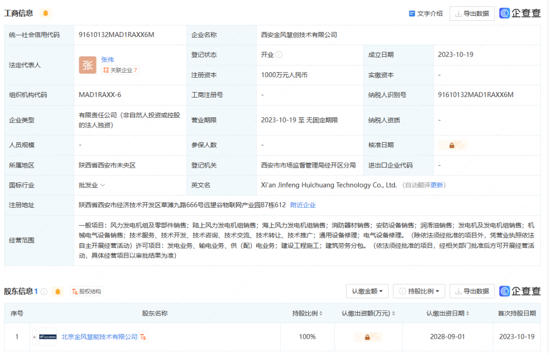 10月19日,西安金风慧创技术有限公司成立,法定代表人为张伟,注册资本1000万元,经营范围包含:风力发电机组及零部件销售;陆上风力发电机组销售;海上风力发电机组销售等。企查查股权穿透显示,该公司由金风科技间接全资持股。