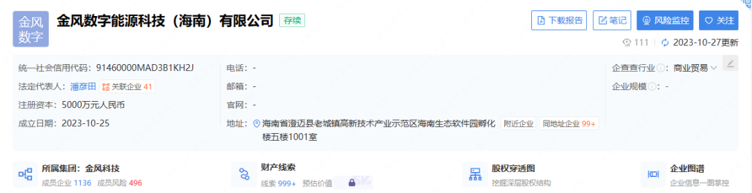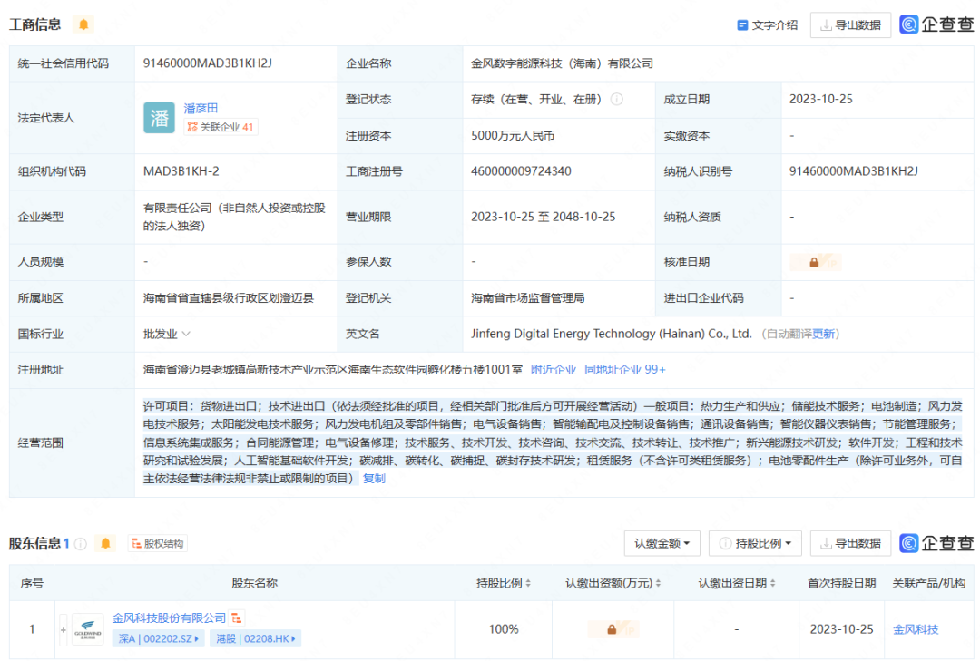 10月25日,金风数字能源科技(海南)有限公司成立,法定代表人为潘彦田,注册资本5000万元,经营范围包含:热力生产和供应;储能技术服务;电池制造;风力发电技术服务;太阳能发电技术服务等。企查查股权穿透显示,该公司由金风科技直接持股。