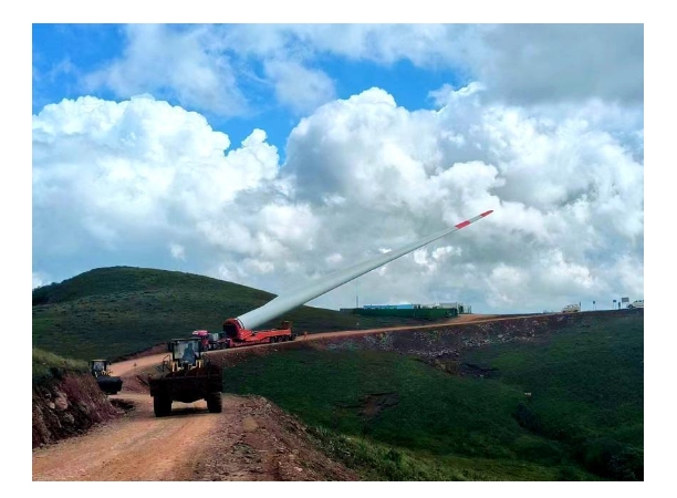 图说:97.3米长的风机叶片像“倚天巨剑”一般驶向海拔3000多米的玛果梁子山脊