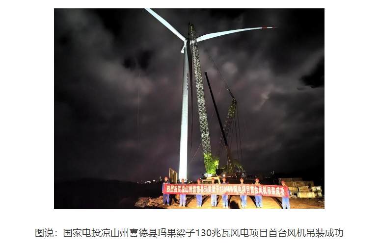 10月28日19点40分,随着首台风机叶轮在110米高空中与机舱精准对接,国家电投喜德县玛果梁子130兆瓦风电项目首台风机吊装完成,标志着凉山州单机容量最大、单个叶片最长的风电项目工程建设取得重大节点性突破。