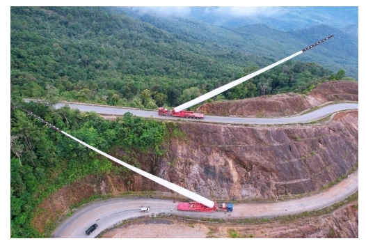 孟松风电项目共设计有133台风力发电机组,机组机舱重达114吨,叶片长84米,需跨中、泰、老3国,经由海路和山路才可运抵现场。“机组在中国生产,中国装船,泰国卸船,再经陆路长途跋涉1225公里,才可送抵色贡省山脚下的换装堆场”,华东院项目经理孙长江介绍道。为确保机组顺利运抵现场,项目团队对当地地形、运输线路进行多次实地踏勘和复测,不断优化运输路径,“仅针对公共道路改造,项目团队就画了500余张图纸”,克服山峦起伏带来的运输困难,一举创下东南亚山地风电叶片最长新纪录。为确保吊装工作全程精准高效,团队运用BIM进行施工工序模拟,预判物流运输、吊装施工过程中的潜在问题和风险,持续优化方案。历时7天连续作业,圆满完成首台风机机组吊装。