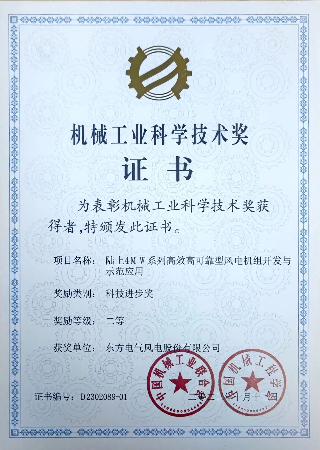 近日,2023年度“机械工业科学技术奖”颁奖仪式暨中国机械工程学会会议在大连举办。东方电气风电股份有限公司主导完成并申报的科技成果“陆上4MW系列高效高可靠型风电机组开发与示范应用”项目荣获科技进步二等奖。