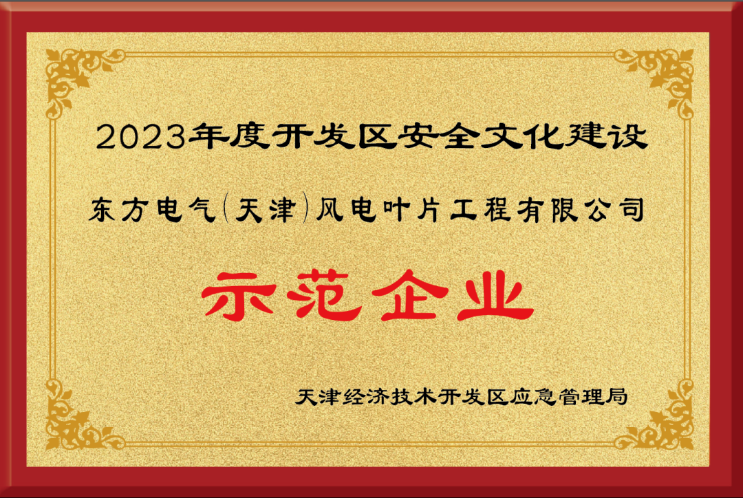 又讯,东方天津叶片于近期顺利通过天津市经开区安全文化建设示范企业创建审查,获评经开区“安全文化建设示范企业”荣誉称号。这是东方天津叶片继通过安全生产标准化二级企业复评工作后,在安全管理方面获得的又一殊荣,这也是对东方天津叶片在安全文化建设工作方面,特别是安全文化建设的方法、理论创新以及实践成效等方面所取得成绩的充分认可。