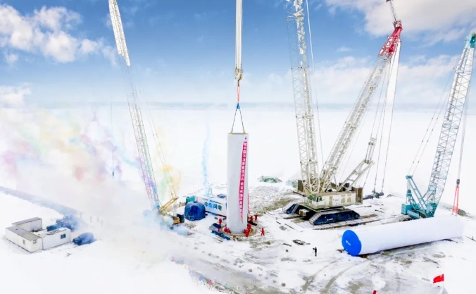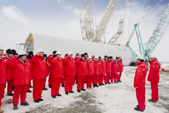 11月5日至7日,吉林长春市、松原市等东北大部地区遭遇暴风雪,工程现场积雪达600毫米,同时寒潮、大风突急而至,温度直降至零下15°C,现场风力高达8~10级,安全起吊风险极大。为保证起吊计划顺利完成,北京分公司执行董事、党委书记张吉明,副总经理赵瑜、马坤,副总经理兼安全总监朱连旺、高级专家王锋国亲赴项目现场进行起吊前的吊装方案审查、起吊时机选定、起吊前的安全检查和技术、管理支持,并慰问一线员工。在起吊前的11月6至7日,张吉明一行,从西安中转北京,再中转长春,7日凌晨,从长春顶着风雪、走乡间小道历经10余小时赶到昂格项目现场。第一时间查看现场风雪及起吊组织、准备情况,和项目部主要管理、技术人员仔细讨论吊装方案,详细了解吊装人员配备、机具安排、吊装工序、安全保障、质量保证等方方面面。张吉明一行还亲自进行起吊前安全喊话,慰问一线员工并认真听取项目设计、采办、总体施工进度安排及安全、质量保障措施开展、落实情况的全面汇报,对整个项目的执行难点、堵点、关键点和后勤保障给出了具体的管理和执行要求,将公司、分公司党委对吉林风电工程的关注、关爱、期望传达到每个参战员工心中。