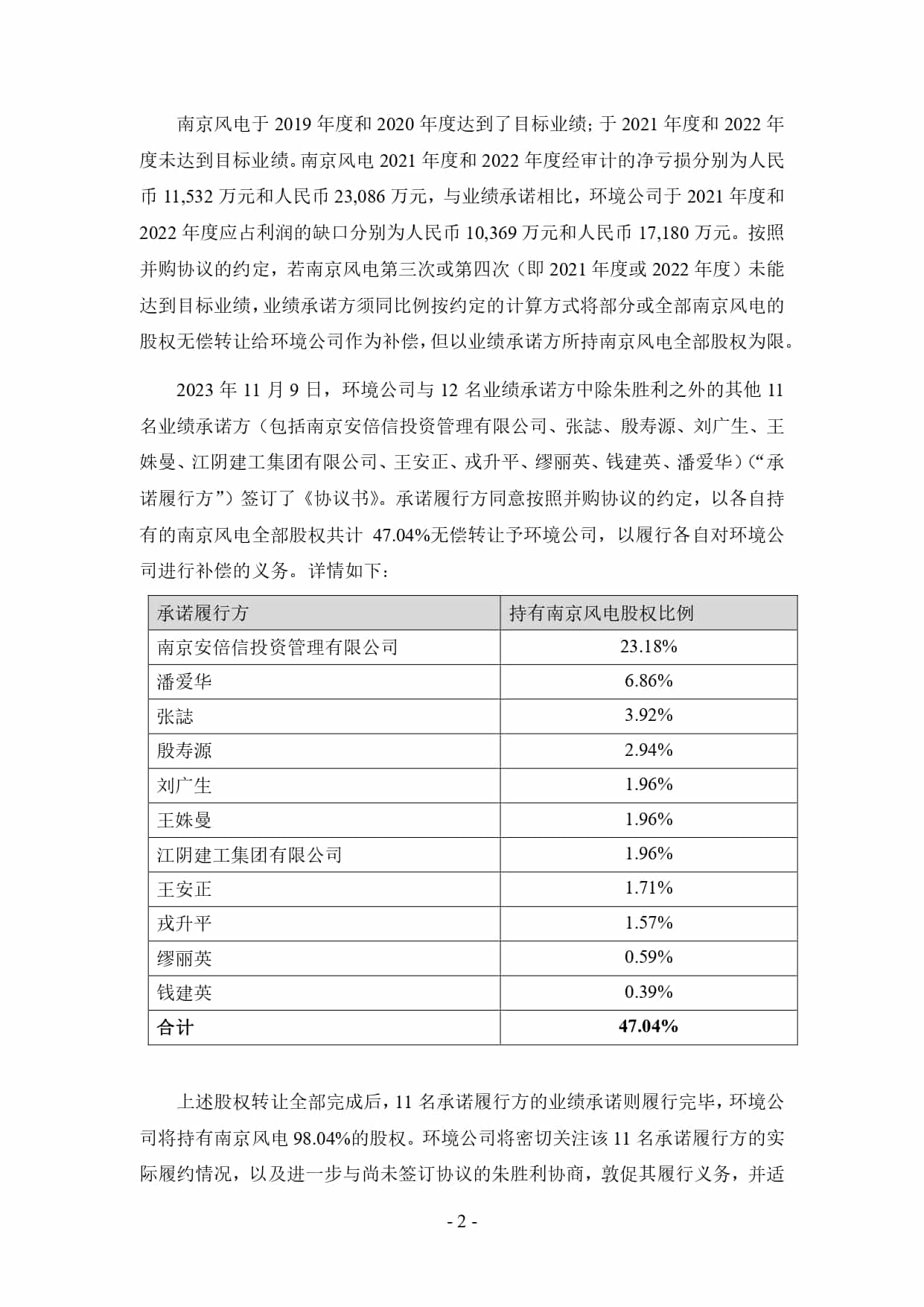 南京风电于2019 年度和2020年度达到了目标业绩;于 2021年度和2022年度未达到目标业绩。南京风电2021年度和2022年度经审计的净亏损分别为人民币11,532 万元和人民币 23,086 万元,与业绩承诺相比,环境公司于2021年度和2022年度应占利润的缺口分别为人民币10,369 万元和人民币17,180 万元。按照并购协议的约定,若南京风电第三次或第四次(即2021年度或2022年度)未能达到目标业绩,业绩承诺方须同比例按约定的计算方式将部分或全部南京风电的股权无偿转让给环境公司作为补偿,但以业绩承诺方所持南京风电全部股权为限。