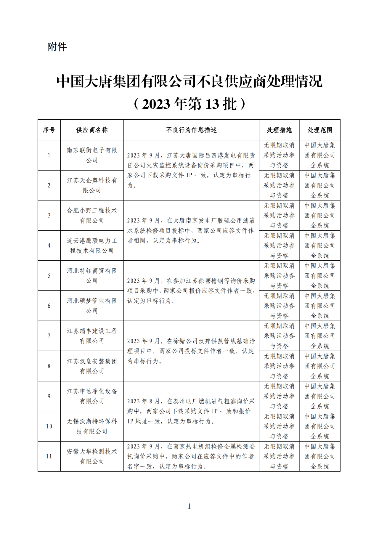 附件:1.中国大唐集团有限有限公司不良供应商处理情况(2023年第13批)