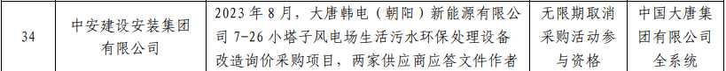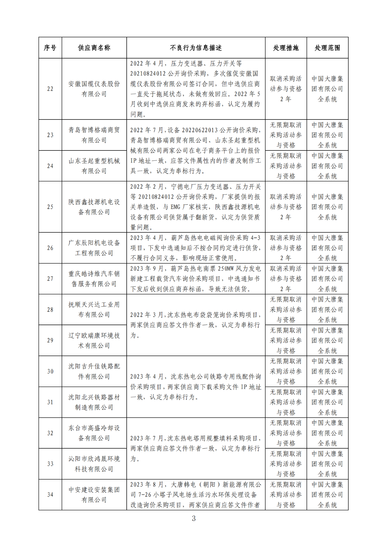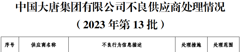 近日,大唐集团发布2023年第13批关于供应商不良行为处理情况的公告。