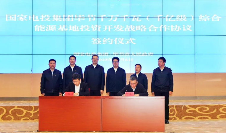 11月6日,国家电投党组书记、董事长钱智民在贵州毕节与贵州省委常委、毕节市委书记吴胜华会谈,并共同出席毕节千万千瓦(千亿级)综合能源基地投资开发战略合作协议签约仪式。
