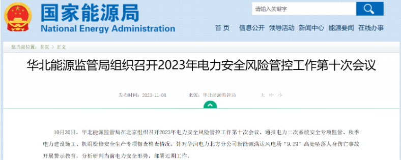 公告显示,10月30日,华北能源监管局在北京组织召开2023年电力安全风险管控工作第十次会议,通报电力二次系统安全专项监管、秋季电力建设施工、机组检修安全生产专项督查检查情况,针对华润电力北方分公司新能源满达风电场“9.29”高处坠落人身伤亡事故开展警示教育,分析研判当前电力安全形势,部署近期工作。