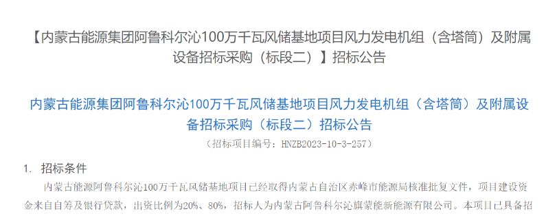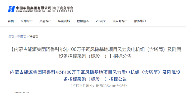 11月14日,中国华能电子商务平台发布内蒙古能源集团阿鲁科尔沁100万千瓦风储基地项目风力发电机组(含塔筒)及附属设备招标采购(标段一)、(标段二)招标公告。