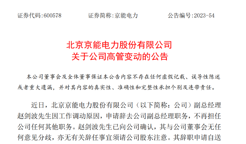 公告披露,近日,京能电力副总经理赵剑波先生因工作调动原因,申请辞去公司副总经理职务,不再担任公司任何其他职务。赵剑波先生已向公司确认,其与公司董事会无任何意见分歧,亦无有关辞任事宜须请公司股东注意。其辞职申请自送达公司董事会时生效。本次人事变动不会影响公司相关工作的正常开展。