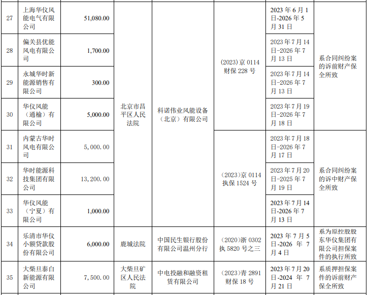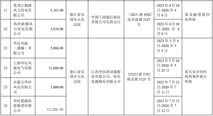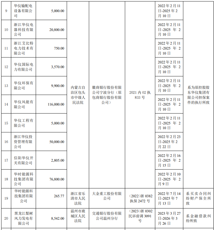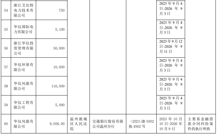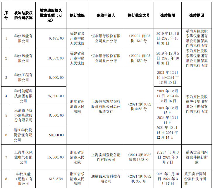 公告披露,华仪电气于近日通过自查确认,发现公司部分下属子公司股权被冻结,其中包括华仪风能有限公司、华仪风能(宁夏)有限公司、华仪风能(通榆)有限公司等60家子公司,原因主要系金融借款、合同纠纷案件的执行所致。