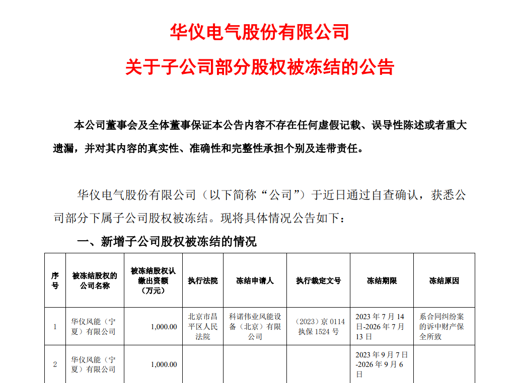 近日,华仪电气股份有限公司(以下简称“华仪电气”或“公司”)发布《关于子公司部分股权被冻结的公告》。