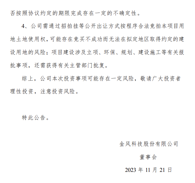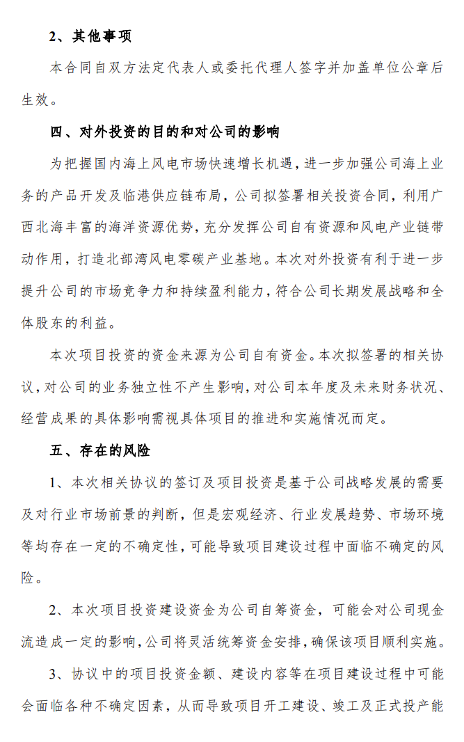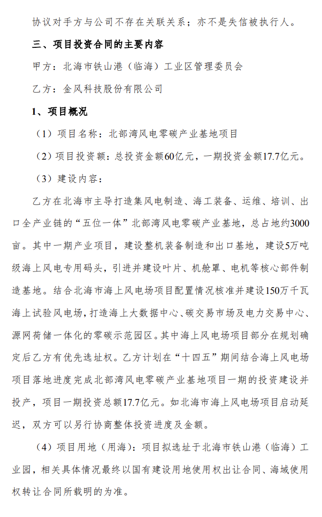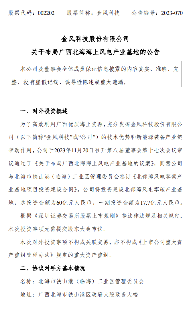 公告称,为了高效利用广西优质海上资源,充分发挥金风科技股份有限公司的技术优势和新能源装备产业链带动作用,公司于2023年11月20日召开第八届董事会第十七次会议审议通过了《关于布局广西北海海上风电产业基地的议案》,同意公司与北海市铁山港(临海)工业区管理委员会签订《北部湾风电零碳产业基地项目投资建设合同》。公司将投资建设北部湾风电零碳产业基地,总投资金额为60亿元人民币,一期投资金额为17.7亿元人民币。