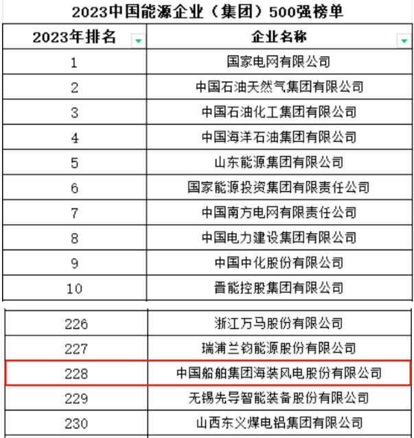 11月16日,中国能源经济研究院公布2023中国能源企业(集团)500强榜单,中船海装风电有限公司(简称“中船海装”)上榜,位列榜单第228名。