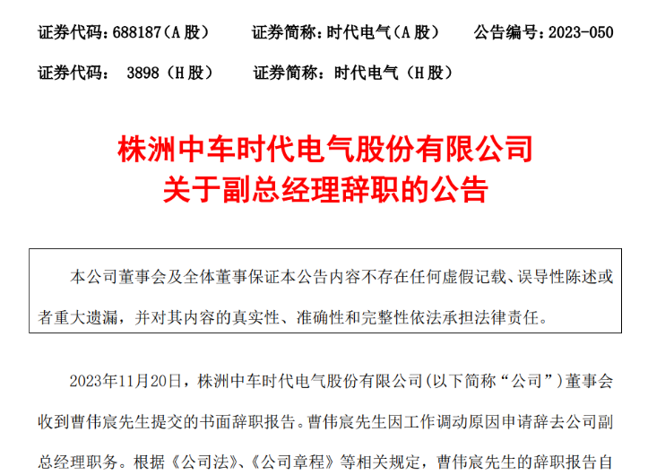 公告披露,2023年11月20日,时代电气董事会收到曹伟宸先生提交的书面辞职报告。曹伟宸先生因工作调动原因申请辞去公司副总经理职务。根据《公司法》、《公司章程》等相关规定,曹伟宸先生的辞职报告自送达董事会之日起生效。截至本公告披露日,曹伟宸先生未持有公司股份。