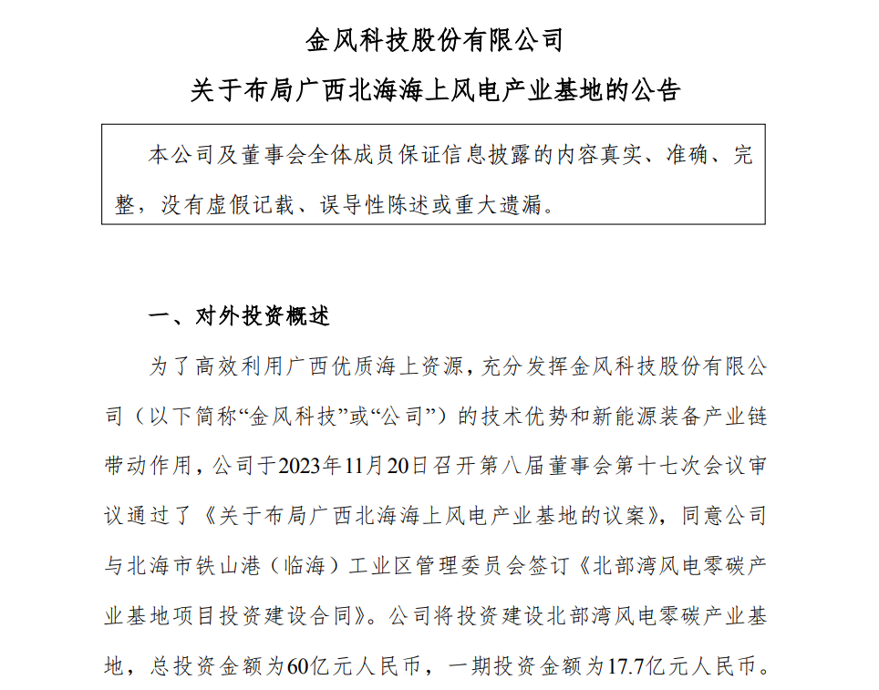 公告披露,为了高效利用广西优质海上资源,充分发挥金风科技的技术优势和新能源装备产业链带动作用,公司于2023年11月20日召开第八届董事会第十七次会议审议通过了《关于布局广西北海海上风电产业基地的议案》,同意公司与北海市铁山港(临海)工业区管理委员会签订《北部湾风电零碳产业基地项目投资建设合同》。公司将投资建设北部湾风电零碳产业基地,总投资金额为60亿元人民币,一期投资金额为17.7亿元人民币。