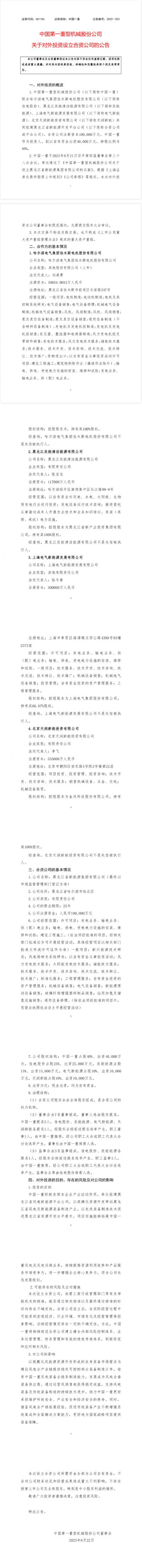 据报道,8月22日,中国一重发布公告,将联合哈尔滨电气集团佳木斯电机股份有限公司(简称:佳电股份)、黑龙江辰能清洁能源有限公司(简称:辰能能源)、上海电气新能源发展有限公司(简称:电气新能源)、北京天润新能投资有限公司(简称:天润新能)共同组建黑龙江省新能源开发平台公司合资公司。