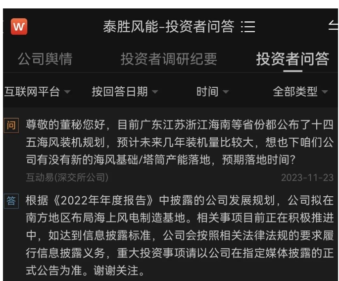 获悉,11月23日有投资者向泰胜风能提问:目前广东江苏浙江海南等省份都公布了十四五海风装机规划,预计未来几年装机量比较大,想也下咱们公司有没有新的海风基础/塔筒产能落地,预期落地时间?