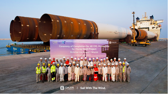 11月22日,本项目第六批次的8根产品已经顺利完成装船工作并从蓬莱大金港发出,至此公司出口英国Moray West海上风电场的48根超大型单桩项目全部如期交付完毕。该项目共60根单桩,大金重工承接了其中的48根,从今年5月至今成功交付了6个批次,并于11月率先完工,第一批次已于10月份开始海上安装。