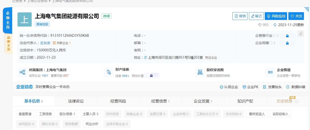 从企查查获悉,近日,上海电气集团能源有限公司成立,注册资本150000万元人民币。新公司由上海电气集团股份有限公司100%持股。