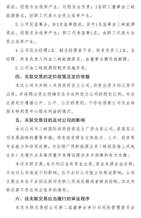 本次与三峡国际共同投资设立广西合资公司,是落实公司发展战略的重要举措,将有效发挥各主体技术、人才、投资等专业能力和协同优势,为后续广西新能源业务(特别是海上风电业务)及境外业务高质量开发建设提供多方保障和有力支撑。
