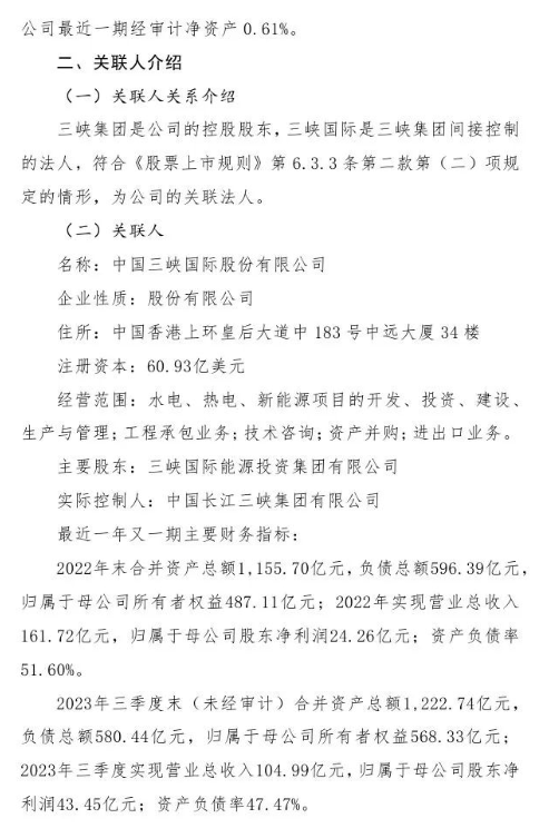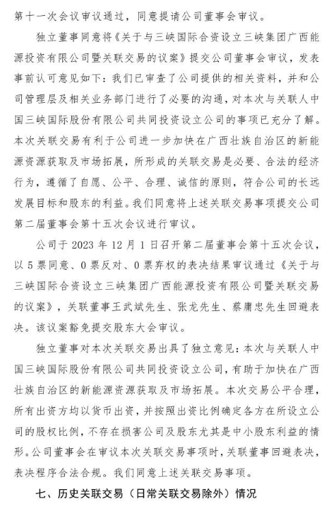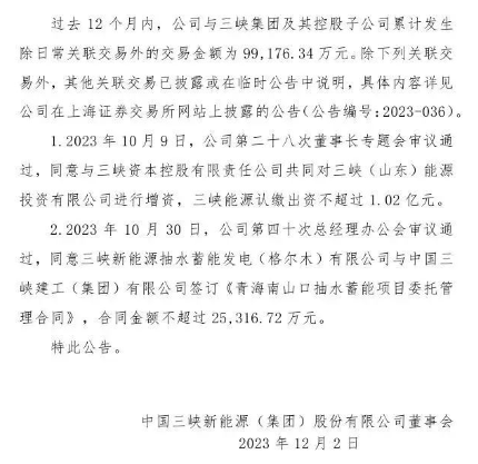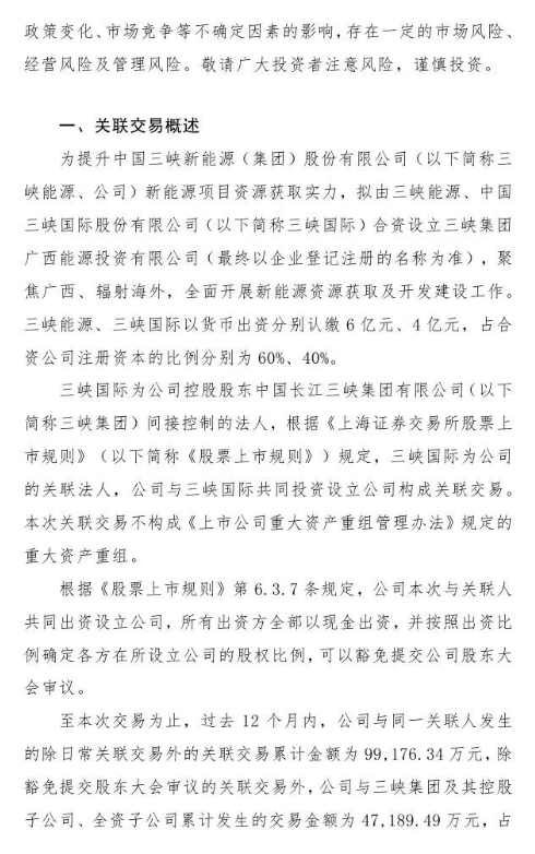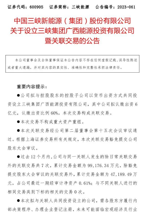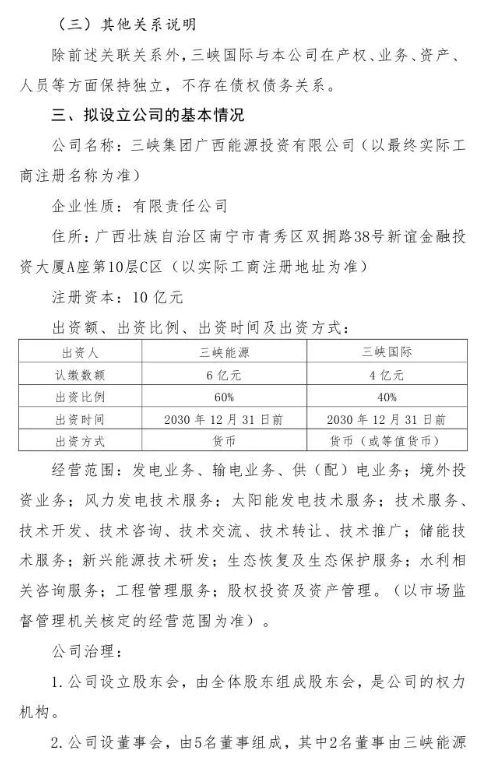 12月2日,中国三峡新能源(集团)股份有限公司发布《关于设立三峡集团广西能源投资有限公司暨关联交易的公告》。