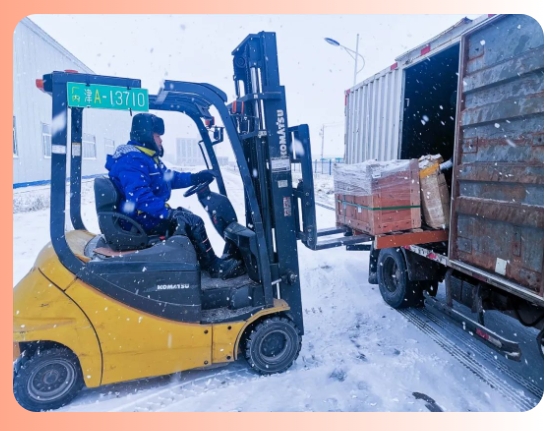在东方风电通榆基地,职工正在雨雪间歇转运吉西鲁固项目的生产物资,保障现场物资需求和任务执行。