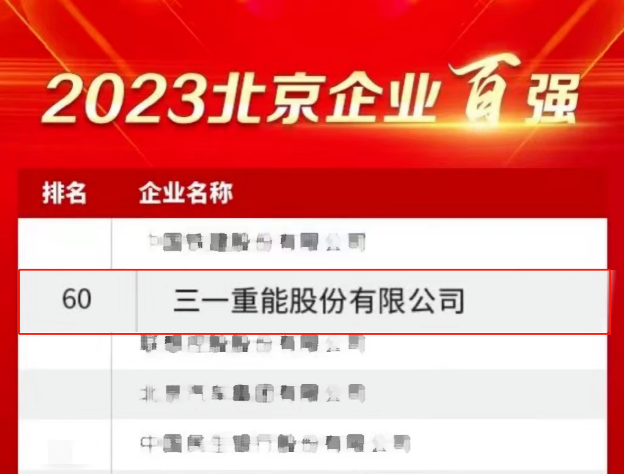 此次评选为深入贯彻习近平新时代中国特色社会主义思想和党的二十大精神,助力北京企业做大做优做强,促进首都经济高质量发展,并为社会各界提供北京大企业发展的相关数据与研究信息。评选参照中国企业 500 强的做法,以 2022 年企业营业收入为入围标准,三一重能在“2023北京企业百强榜单”中排名第60位,在“2023北京制造业企业百强榜单”中排名第18位。