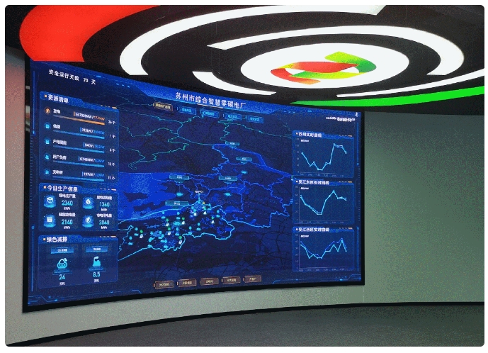 苏州综合智慧零碳电厂是全国首座接受省级电网调度的综合智慧零碳电厂,由江苏公司携手国网苏州供电公司,采用上海成套院自主研发的虚拟电厂技术开发建成,将客户末端负荷、各类分布式能源以市场化手段聚合起来,构建可调负荷资源池,直接接受电网调度,在供给侧、需求侧两端发力,积极探索参与响应服务、辅助服务、电力现货等市场模式。截至目前,项目总装机容量914兆瓦,具备顶峰能力265兆瓦,调峰能力232兆瓦,相当于传统火电300兆瓦机组出力,可补充苏州市约10%的电力缺口,年发绿电量约6818万千瓦时(相当于3万户家庭的1年用电需求),减少二氧化碳排放约6万吨(相当于种植315万棵树木的固碳能力),为电力系统提供可靠的灵活调节,保障了区域能源供应安全并且促进新能源消纳。