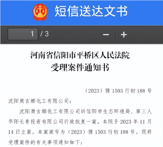 2023年10月18日,奥吉娜公司依据《行政诉讼法》和《行政诉讼法解释》,将信阳市环境局和第三人华阳长青公司诉至信阳市平桥区人民法院,请求法院:1、判决撤销被告作出的《信阳市生态环境局关于沈阳奥吉娜化工有限公司举报华阳长青投资有限公司违法经营及固始分局不作为、乱作为等问题调查处理的函》;2、责令被告针对原告于2023年8月3日向被告申诉举报华阳长青投资有限公司事项,限期进行重新调查和答复;3、请求人民法院判令被告2023年9月13日调查处理函认定的废合成油不应按危险废物有关规定进行管理,违反法律规章的规定,无效。