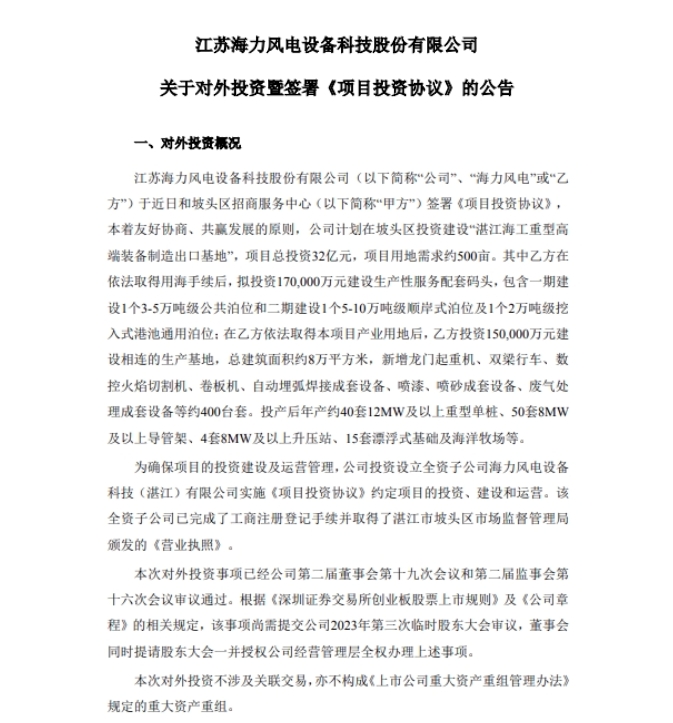 海力风电近日和广东湛江坡头区招商服务中心签署《项目投资协议》,将在坡头区投资建设“湛江海工重型高端装备制造出口基地”,项目总投资32亿元。