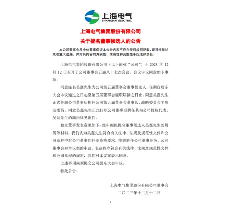 12日晚间,上海电气发布关于提名董事候选人的公告,同意提名吴磊先生为公司第五届董事会董事候选人,任期自股东大会审议通过之日起至第五届董事会履职届满之日止。同意吴磊先生正式任职公司董事后担任公司第五届董事会董事长、战略委员会主席及委员。同意吴磊先生正式任职公司董事后聘任其为公司授权代表。