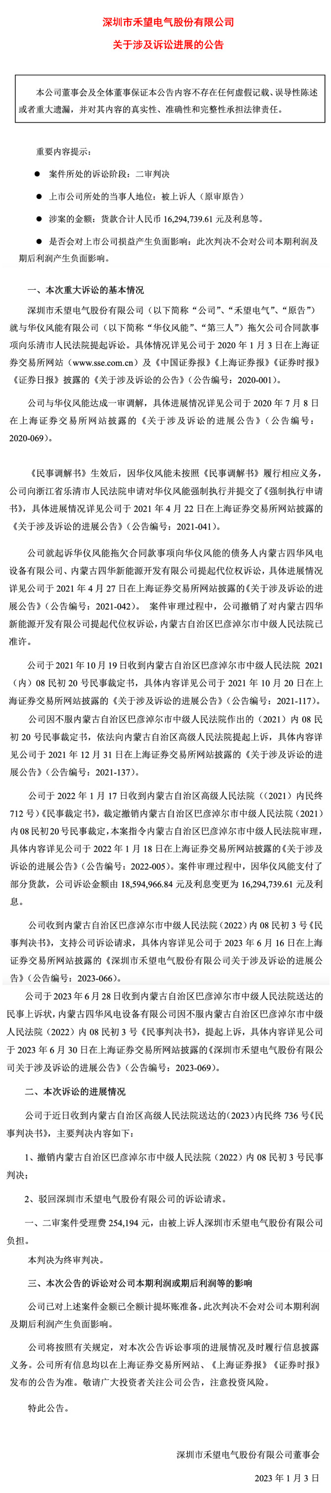 1月3日,深圳市禾望电气股份有限公司收到内蒙古自治区高级人民法院送达的《民事判决书》,主要判决内容如下:撤销内蒙古自治区巴彦淖尔市中级人民法院(2022)内08民初3号民事判决;驳回深圳市禾望电气股份有限公司的诉讼请求;此为最终判决。禾望电气曾在2020年将华仪风能诉至公堂,涉案货款1859.50万元,仍有1629.47万元未支付。