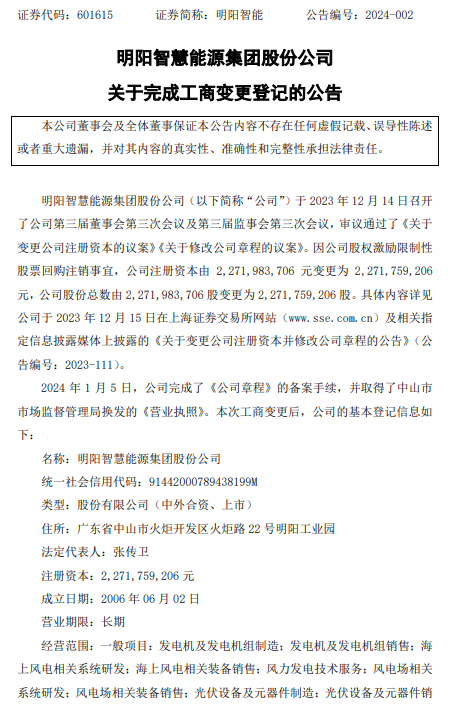1月6日,明阳智慧能源集团股份公司(简称“明阳智能”)发布《关于完成工商变更登记的公告》。