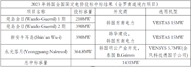 近日,2023年韩国全国第二次固定电价项目有4处海上风电项目成功中标,总项目容量1431MW。