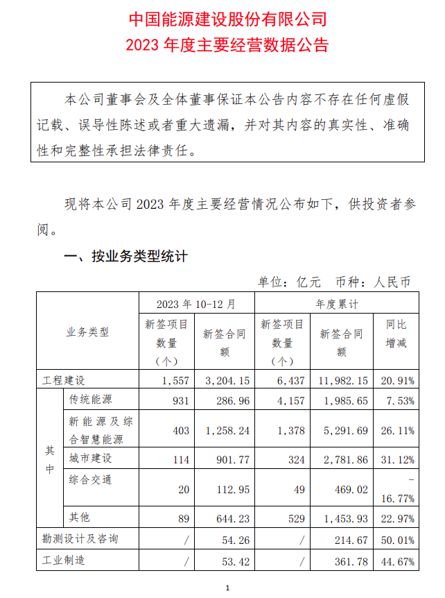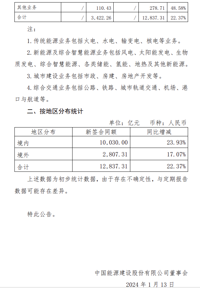 1月13日,中国能建发布《2023 年度主要经营数据公告》。