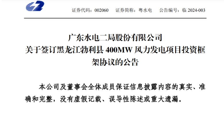 1月12日,广东水电二局股份有限公司(以下简称“粤水电”或“公司”)发布《关于签订黑龙江勃利县 400MW 风力发电项目投资框架协议的公告》。