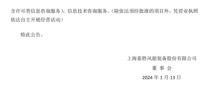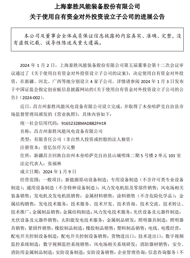 1月13日,泰胜风能发布《关于使用自有资金对外投资设立子公司的进展公告》。