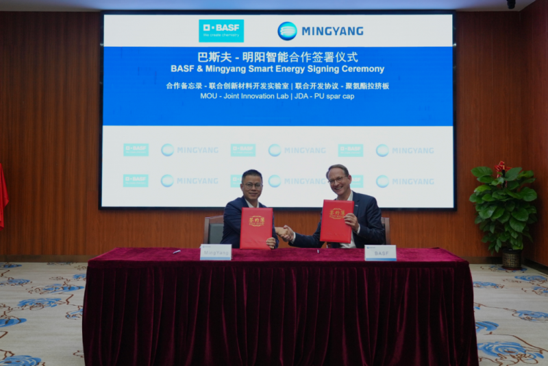 1月16日,巴斯夫特性材料与明阳智能签署两项创新合作协议,同时庆祝首次深度合作的达成。根据这两项协议,双方将签署联合创新开发实验室的合作备忘录及针对聚氨酯复合大梁板的深度战略合作,旨在携手推动风电叶片行业的高质量可持续发展。